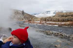 I have reached the destination of my wildest dreams. Oh what a wonderful feeling it is! To be enveloped in this land and this place at this time in my life, a well planned whim. Here I am! I am home!I reached my new house in Bozeman on December 23; my life partner Genevieve and our newborn son River arrived on December 28. Now, finally, on January 14, I made it into Yellowstone National Park for the first time, although I only went as far as Mammoth Hot Springs.